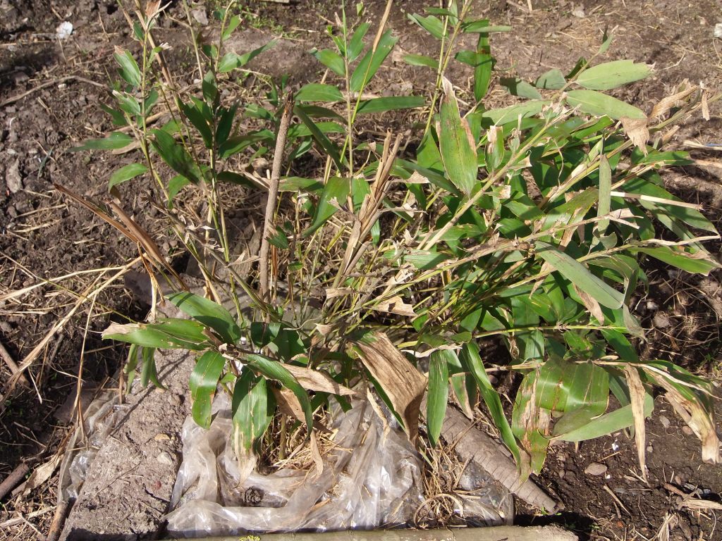 Bamboo from outside greenhouse is one with longest rhizome for now. It is growing after every rain and after removing greenhouse construction I was able to inspect surface under the thick layer of hay. Only few smaller rhizomes are on that level (those that were there before), others are deeper in the ground. Since it has a nice amount of leaf mass I presume that underground development of the rhizomes is progressing normally. Fertilization is required and it will be done by chicken manure because it is safer and more lasting than artificial fertilizers. 4 other bamboos that were partially eaten by rodents this winter managed to survive. They have recovered nicely and started to grow.